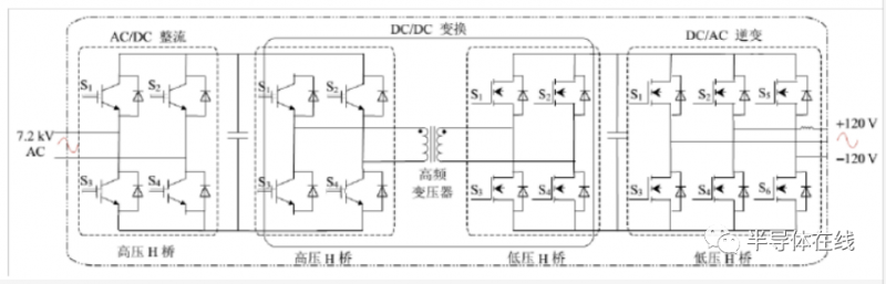 隨著分布式發(fā)電系統(tǒng)、 智能電網(wǎng)技術(shù)以及可再生能源的發(fā)展, 固態(tài)變壓器作為其中的關(guān)鍵技術(shù)受到廣泛關(guān)注。固態(tài)變壓器是一種以電力電子技術(shù)為核心的變電裝置,它通過電力電子變流器和高頻變壓器實(shí)現(xiàn)電力系統(tǒng)中的電壓變換和能量傳遞及控制, 以取代電力系統(tǒng)中的傳統(tǒng)的工頻變壓器。與傳統(tǒng)變壓器相比, 具有體積小、重量輕等優(yōu)點(diǎn), 同時具有傳統(tǒng)變壓器所不具備的諸多優(yōu)點(diǎn),包括供電質(zhì)量高、功率因數(shù)高、自動限流、具備無功補(bǔ)償能力、頻率變換、輸出相數(shù)變換以及便于自動監(jiān)控等優(yōu)點(diǎn)。固態(tài)變壓器的輸入側(cè)電壓等級非常高, 一般在數(shù)千至數(shù)萬伏,目前多采用拓?fù)浠蚱骷?lián)的方式, 結(jié)構(gòu)較為復(fù)雜。圖5所示為 10kVA的固態(tài)變壓器示意圖 [9]。新興的碳化硅電力電子器件, 特別是 15kV以上碳化硅 MOSFET、IGBT的出現(xiàn),將有利于固態(tài)變壓器的結(jié)構(gòu)簡化及可靠性提升。