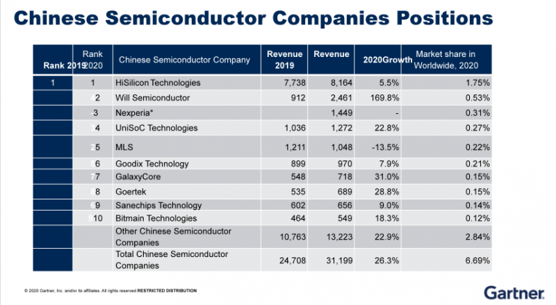 具體到公司層面,海思半導體在中國大陸半導體企業(yè)中遙遙領先,不過美國制裁影響下的海思2021年可能遭遇雪崩式滑坡,哪些公司有潛力取代海思的位置就成為關鍵。據(jù)Gartner統(tǒng)計的營收數(shù)據(jù),韋爾半導體、安世半導體排名僅次于海思,但盛陵海坦言:“我們很難斷言這些產(chǎn)品是否可以在短時間內(nèi)迅猛成長。”紫光展銳、匯頂科技和格科微等公司都具有一定潛力??傮w而言,大陸前十大半導體公司近年營收增長都十分迅速。但由于全球前十半導體企業(yè)營收門檻大幅提高,大陸企業(yè)的迅速成長并不能體現(xiàn)在全球市場份額上。Gartner統(tǒng)計結果顯示,2020年大陸半導體企業(yè)營收總額在全球只占6.7%的市場份額。