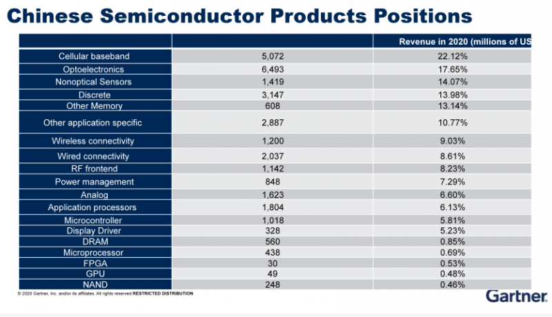 分產(chǎn)品來看,手機基帶芯片、光電子、非光學傳感器、分立器件等在全球的市場份額較高,均超過10%。而DRAM、微處理器、FPGA、GPU、NAND Flash等產(chǎn)品與國外存在較大差距,市占率低于1%,基本處于空白狀態(tài)。