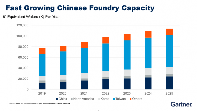不過,Gartner預測,到2025年,大陸半導體公司在中國大陸市場的份額,有機會從當下的15%突破到30%。大陸代工企業(yè)預計未來幾年會有較大成長,從全球布局角度來看,預計未來中國大陸代工業(yè)將成為僅次于中國臺灣的全球第二大地區(qū)。
