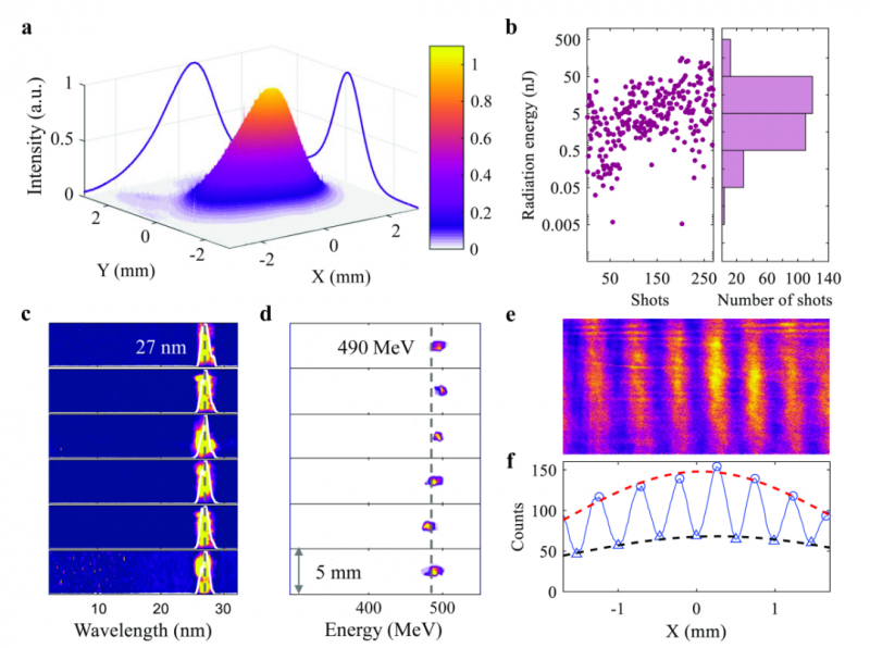 研究團隊通過顯著提升激光尾波場加速的電子束品質(zhì),并結(jié)合創(chuàng)新設(shè)計的緊湊型束流傳輸與輻射系統(tǒng),實驗上首次實現(xiàn)了基于激光加速器的自由電子激光放大輸出,典型激光波長27納米,最短激光波長可達10納米級,單脈沖能量可達100納焦級,國際率先完成了臺式化自由電子激光原理的實驗驗證,對于發(fā)展小型化、低成本自由電子激光器具有重大意義。