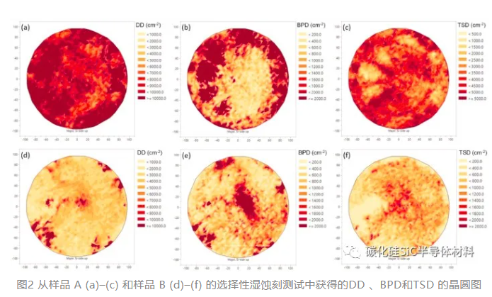 圖 2顯示了總?cè)毕菝芏?DD)、BPD 和 TSD 晶片圖,通過(guò)對(duì)來(lái)自兩個(gè)不同生長(zhǎng)運(yùn)行的晶片進(jìn)行選擇性蝕刻獲得。特別是,圖 2 (a)–(c) 中的圖是指在 200 mm 晶圓開(kāi)發(fā)的早期階段生產(chǎn)的晶圓(以下稱為樣品 A),而圖 2 (d)–(f)中的圖) 是在使用改進(jìn)的生長(zhǎng)工藝生長(zhǎng)的晶片上獲得的(以下稱為樣品 B)。樣品 A 的總 DD 的平均值大約為 11,000 cm -2,晶片內(nèi)的 BPD 變化很大,如圖2 (b) 所示。樣品 A 的平均位錯(cuò)密度為 11,256 cm -2、1807 cm -2和 3739 cm-2 分別表示 DD、BPD 和 TSD。相比之下,樣品 B 的總 DD 小于 4000 cm -2,即幾乎比樣品 A 低三倍。樣品 B 的平均位錯(cuò)密度為 3885 cm -2、951 cm -2和 716 cm - 2為DD,BPD和TSD,分別。與樣品A相比,這是一個(gè)顯著的改進(jìn);樣品 B 的 DD 改進(jìn)歸因于更好的晶種晶體質(zhì)量和優(yōu)化的生長(zhǎng)參數(shù)。這對(duì)于未來(lái)高質(zhì)量 200 mm SiC 晶片的發(fā)展來(lái)說(shuō)是一個(gè)很有希望的結(jié)果。值得注意的是在 0.25 cm -2的晶片上測(cè)得的平均微管密度低于 0.5 cm -2的目標(biāo)并且已經(jīng)非常接近商用 150 mm SiC n 型襯底的當(dāng)前值,即 <1 cm -2。