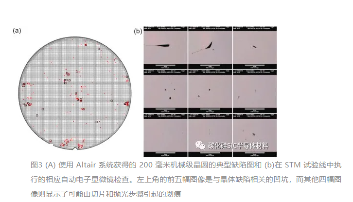第一批晶圓在邊緣處顯示出很少的小芯片,這導(dǎo)致了工具內(nèi)的對(duì)齊問(wèn)題。II-VI Incorporated 解決并迅速解決了邊緣芯片的形成問(wèn)題。圖 3顯示了在 STM 生產(chǎn)線上對(duì) 200 毫米 SiC 晶片進(jìn)行的缺陷圖和自動(dòng)電子顯微鏡檢查的示例。在基材表面發(fā)現(xiàn)了一些缺陷,主要是劃痕和凹坑。缺陷的類型和位置表明晶片制造過(guò)程中的切片和拋光步驟需要進(jìn)一步優(yōu)化。