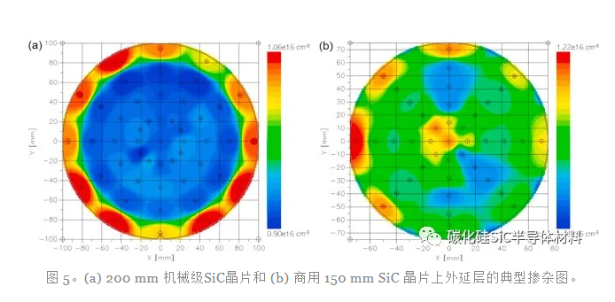 圖5(a)和(b)顯示了對(duì)應(yīng)于圖4中已經(jīng)呈現(xiàn)的外延層的摻雜圖,分別生長(zhǎng)在(a)200mm SiC晶片和(b)150mm SiC商業(yè)晶片上。200mm晶圓的平均摻雜值為9.54×10 15 cm -3,標(biāo)準(zhǔn)偏差為0.53×10 15 cm -3,晶圓摻雜均勻度為5.6%。另一方面,商用 150 mm 晶圓的平均摻雜值為 11.9 × 10 15 cm -3,標(biāo)準(zhǔn)偏差為 0.14 × 10 15 cm -3,以及 1.1% 的晶圓摻雜均勻度。盡管機(jī)械級(jí) 200 毫米晶圓已經(jīng)顯示出良好的厚度和摻雜分布,但使用更先進(jìn)的 200 毫米外延反應(yīng)器最終版本,摻雜的晶圓均勻性將得到改善。