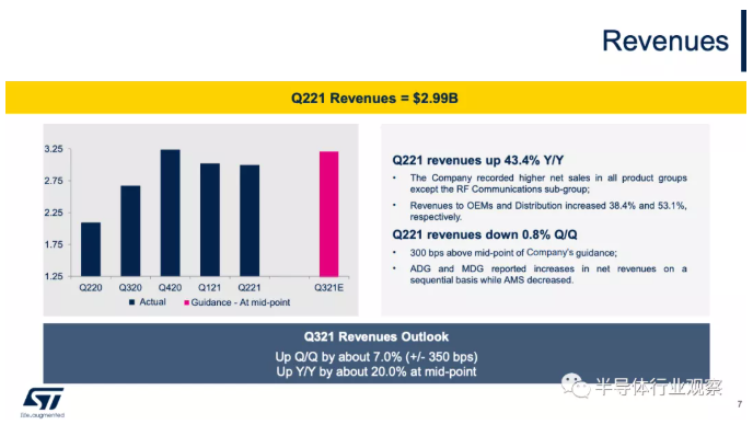 日前,意法半導(dǎo)體公布了截止至2021年7月3日的第二季度財務(wù)業(yè)績。數(shù)據(jù)顯示,Q2凈營收為29.92億美元,上年同期為20.87億美元,同比增長43.4%,環(huán)比下降0.8%。