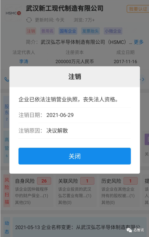 根據(jù)企查查顯示,此前已“爛尾”的武漢弘芯半導體項目(以下簡稱“弘芯”)在今年5月更名武漢新工現(xiàn)代制造有限公司之后,已于今年6月29日正式注銷。