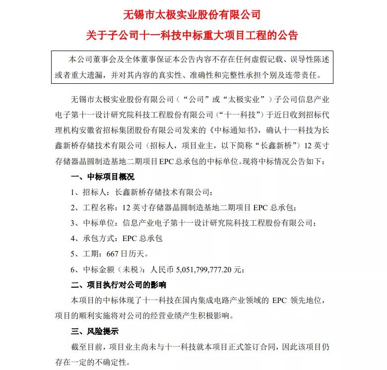8月3日,無(wú)錫市太極實(shí)業(yè)股份有限公司(以下簡(jiǎn)稱“太極實(shí)業(yè)”)發(fā)布關(guān)于子公司十一科技中標(biāo)重大項(xiàng)目工程的公告。
