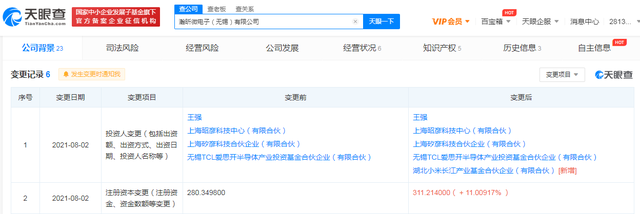 瀚昕微電子(無(wú)錫)有限公司成立于2019年12月,法定代表人為王強(qiáng),經(jīng)營(yíng)范圍含集成電路的研發(fā),自有研發(fā)成果的轉(zhuǎn)讓,并提供相關(guān)技術(shù)咨詢和技術(shù)服務(wù);集成電路芯片的批發(fā)、進(jìn)出口等。股東信息顯示,該公司由湖北小米長(zhǎng)江產(chǎn)業(yè)基金合伙企業(yè)(有限合伙)、無(wú)錫TCL愛(ài)思開半導(dǎo)體產(chǎn)業(yè)投資基金合伙企業(yè)(有限合伙)等共同持股。