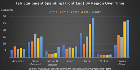 Dieseldorff在描述亞洲半導體制造商的強勁投資時,列舉了許多方面,這些投資已經把歐洲、日本和美國遠遠甩在后面。在2020年至2022年的三年期間,美洲地區(qū)的晶圓廠投資將下降20%,到2022年下降到60億美元(如果不包括英特爾和美光)。支出大戶是中國臺灣地區(qū)的臺積電,以及韓國的SK海力士和三星,中國在這三年期間的投資繼續(xù)增長,今年的投資增加了31%,達到150億美元。