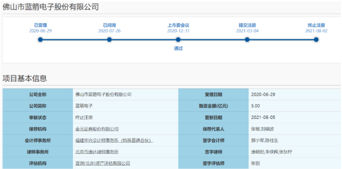 根據(jù)披露的文件顯示,2021年7月19日,藍箭電子和保薦機構(gòu)金元證券股份有限公司提交了《佛山市藍箭電子股份有限公司關(guān)于撤回首次公開發(fā)行股票并在科創(chuàng)板上市申請文件的申請》(藍箭電子【20210719】01號)和《金元證券股份有限公司關(guān)于撤回佛山市藍箭電子股份有限公司首次公開發(fā)行股票并在科創(chuàng)板上市申請文件的申請》(金證〔2021】170號),主動要求撤回注冊申請文件。