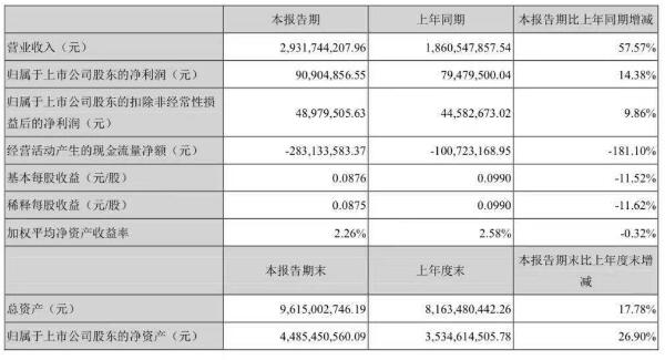 半導體產(chǎn)業(yè)網(wǎng)消息:8月8日晚,洲明科技發(fā)布2021年半年度報告,公司實現(xiàn)營業(yè)收入29.32億元,同比增長57.57%;歸屬于上市公司股東的凈利潤9090.49萬元,同比增長14.38%??鄯莾衾麧?897.95萬元,同比上升9.86%;負債率53.44%,投資收益-170.86萬元,財務費用3800.95萬元,毛利率24.29%。