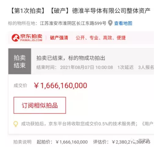 自2021年8月6日10時(shí)拍賣活動(dòng)開始,至2021年8月7日10時(shí)左右結(jié)束,參與“德淮半導(dǎo)整體資產(chǎn)”拍賣活動(dòng)的報(bào)名人數(shù)共有3人,但是實(shí)際僅1人出價(jià),估最終“德淮半導(dǎo)整體資產(chǎn)”以16.6616億元的起拍價(jià)被成功拍出。