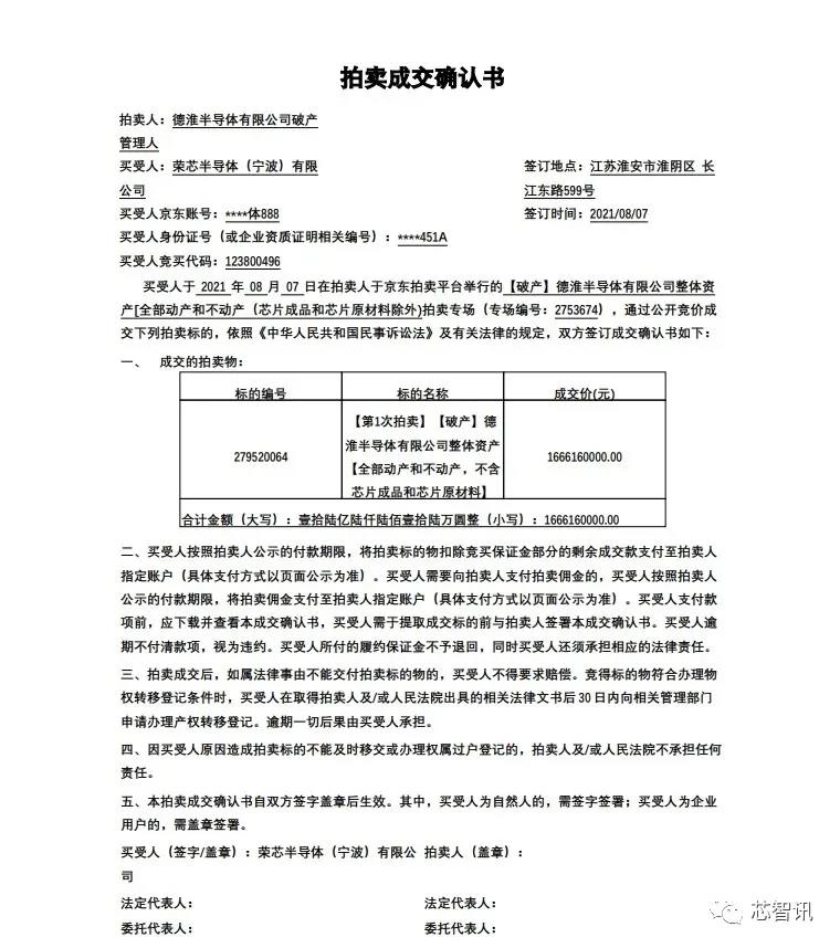 根據(jù)拍賣成交確認(rèn)書顯示,此次拍下“德淮半導(dǎo)整體資產(chǎn)”的正是剛剛成立不久的榮芯半導(dǎo)體。
