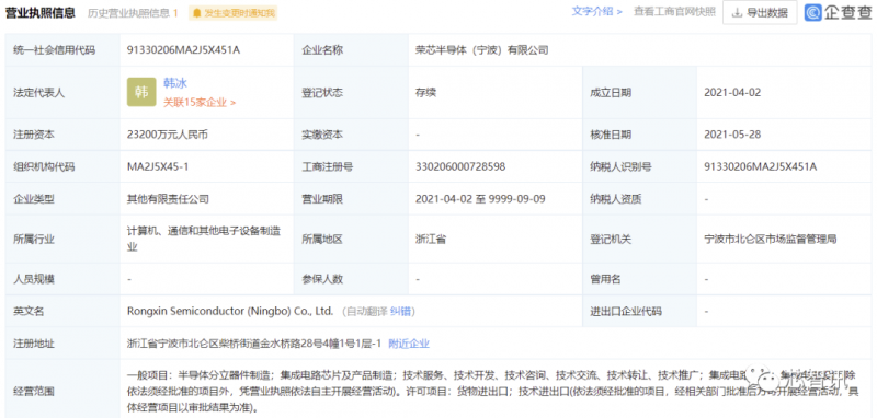 根據(jù)企查查上的資料顯示,榮芯半導(dǎo)體成立于今年4月2日,注冊(cè)資金2.32億元,經(jīng)營范圍包括:半導(dǎo)體分立器件制造;集成電路芯片及產(chǎn)品制造;技術(shù)服務(wù)、技術(shù)開發(fā)、技術(shù)咨詢、技術(shù)交流、技術(shù)轉(zhuǎn)讓、技術(shù)推廣;集成電路銷售;集成電路設(shè)計(jì)。許可項(xiàng)目:貨物進(jìn)出口;技術(shù)進(jìn)出口。法人代表為韓冰。