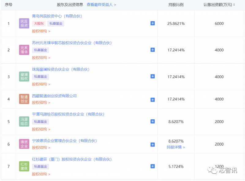 榮芯半導(dǎo)體的其他股東還包括:蘇州元禾璞華智芯股權(quán)投資合伙企業(yè)(有限合伙),持股17.2414%;珠海鎣瀾投資合伙企業(yè)(有限合伙),持股17.2414%;西藏智通創(chuàng)業(yè)投資有限公司,持股17.2414%;平潭馮源繪芯股權(quán)投資合伙企業(yè)(有限合伙),持股8.6207;寧波德賢企業(yè)管理合伙企業(yè)(有限合伙),持股8.6207%;紅杉建辰(廈門)股權(quán)投資合伙企業(yè)(有限合伙),持股5.1724。