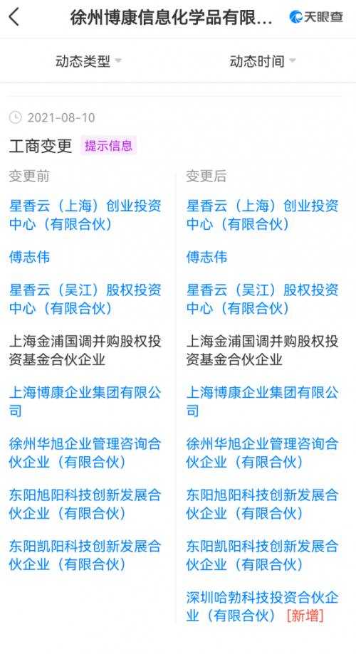 8月11日,徐州博康信息化學品有限公司工商信息發(fā)生變更,新增深圳哈勃科技投資合伙企業(yè)(有限合伙)為股東。