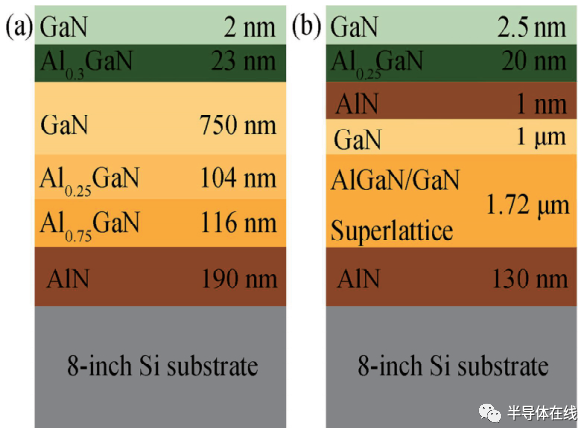 圖1 采用組分漸變 AlGaN 的緩沖層結(jié)構(gòu)(a)和 AlGaN/GaN超晶格的緩沖層結(jié)構(gòu)(b)[12]