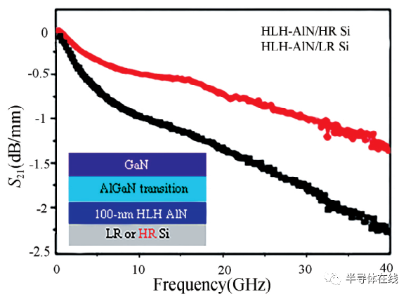 圖2 高低阻Si襯底上外延100nm HLH AlN 的射頻損耗[15]