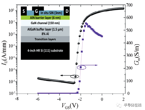 在 毫 米 波 功 率 方 面, 法 國(guó) IEMN 的 Medjdoub等[35]于2012年 在 4 英 寸 高 阻 Si襯 底 上 制 備 了 AlN/GaN HEMT器件并展示了首個(gè)40GHz頻率下的功率測(cè)試結(jié)果,得 到 Pout為 2.5 W/mm,器 件 結(jié) 構(gòu) 及 ID-VGS曲線如圖6所示;2013年 Medjdoub 等[36]又將 40GHz下 的 Pout提 高 到 3.2 W/mm;2015 年 ETH 的Marti等[26]報(bào)道了國(guó)際上首個(gè) W 波段 Si基 GaN 射頻器件,工作頻率為94GHz時(shí),Pout達(dá)1.35 W/mm。