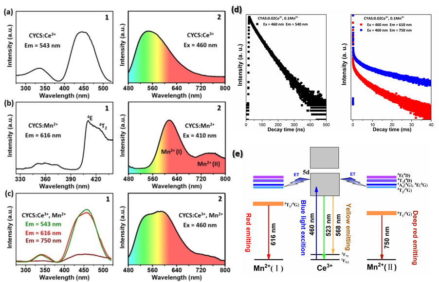圖3 CYAS: Ce3+的激發(fā)和發(fā)射光譜圖(a),CYAS: Mn2+的激發(fā)和發(fā)射光譜圖(b),CYAS: Ce3+,Mn2+的激發(fā)和發(fā)射光譜圖(c),Ce3+和Mn2+在CYAS:0.02Ce3+,0.1Mn2+中的熒光壽命衰減曲線圖(d)和Ce3+-Mn2+之間的能量傳遞示意圖(e)。