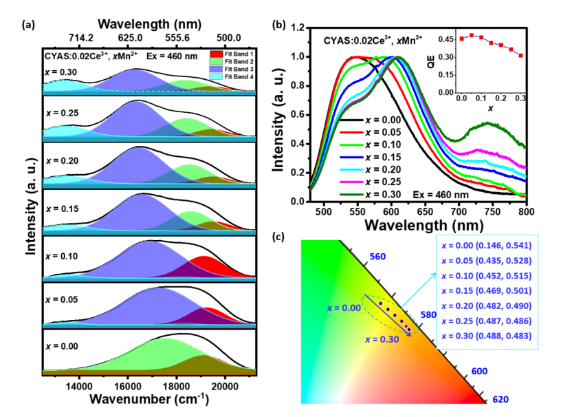圖4 CYAS:0.02Ce3+,xMn2+熒光粉(x = 0.00- 0.30)高斯擬合圖(a),歸一化的發(fā)射光譜圖,插圖為量子效率與Mn2+摻雜濃度的關(guān)系圖(b)和色坐標(biāo)圖(c) (λex= 460 nm)。