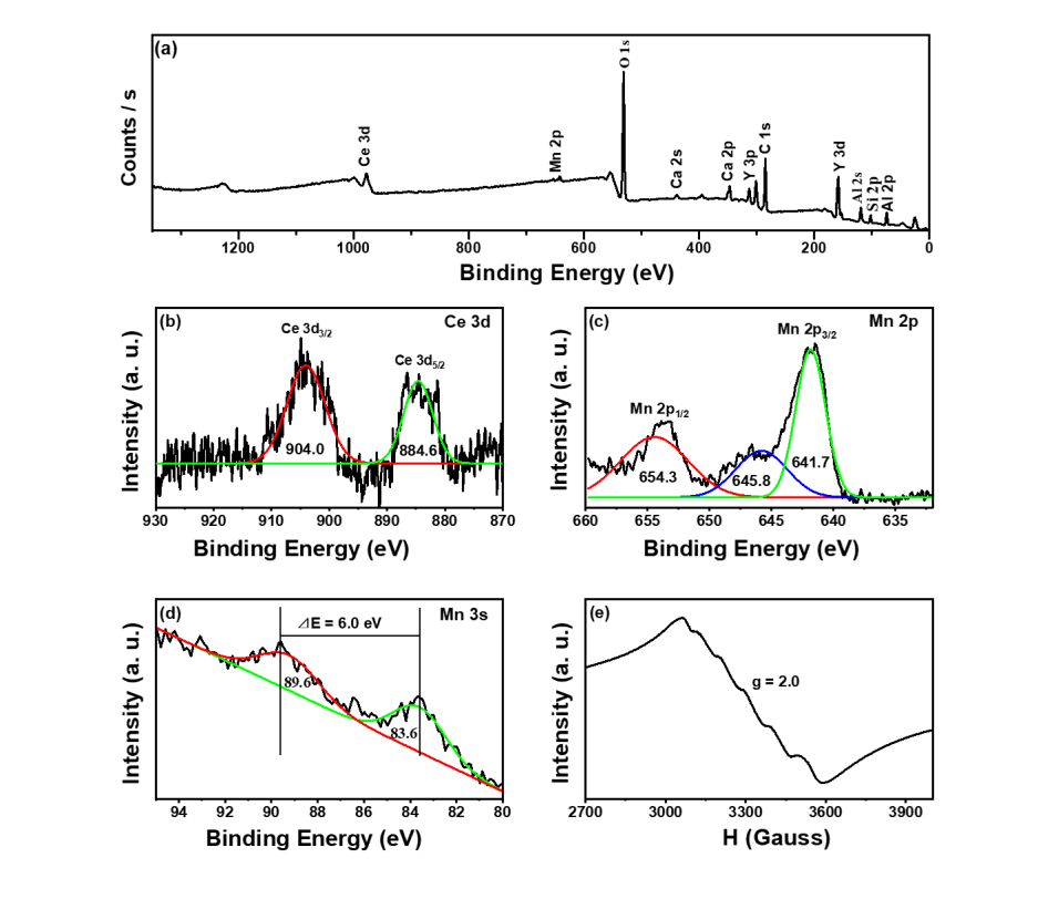 圖2 CYAS:0.02Ce,0.30Mn的XPS譜(a),Ce3d的高分辨XPS譜(b),Mn2p的高分辨XPS譜(c),Mn3s的高分辨XPS譜(d)和CYAS:0.02Ce,0.05Mn中Mn的EPR(e)。