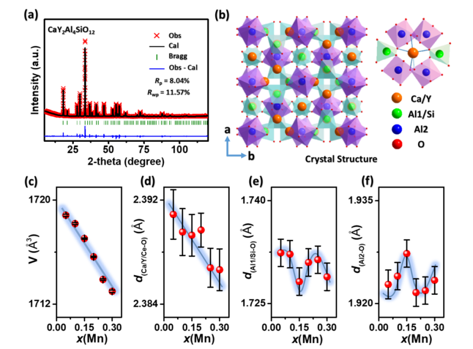 圖1 XRD Rietveld精修結(jié)果(a),CaY2Al4SiO12的晶體結(jié)構(gòu)圖(b),晶胞體積與Mn濃度的關(guān)系圖(c)和陽離子與氧離子之間的鍵長與Mn濃度的關(guān)系圖(d-f)。