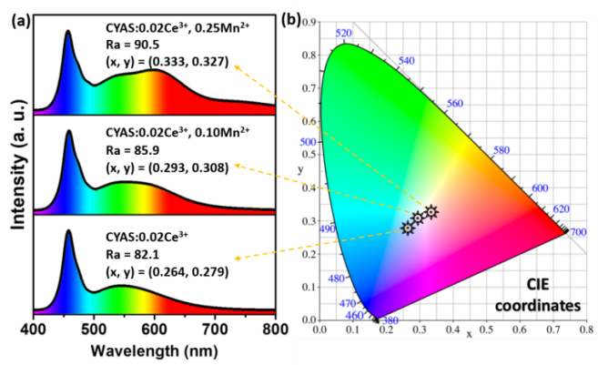 近日,廣東省科學(xué)院資源利用與稀土開發(fā)研究所(原廣東省科學(xué)院稀有金屬研究所)倪海勇教授團(tuán)隊(duì)與中山大學(xué)吳明娒教授團(tuán)隊(duì)等合作,通過化學(xué)單元共取代策略以[Ca2+-Si4+]共取代[Al3+-Al3+]單元,構(gòu)建了石榴石結(jié)構(gòu)的CaY2Al4SiO12(CYAS)。作者在該基質(zhì)中利用Ce3+-Mn2+能量傳遞,獲得在藍(lán)光激發(fā)下發(fā)射光譜覆蓋范圍廣且顏色變化可調(diào)的系列熒光粉,并與藍(lán)光LED器件封裝得到了顯色指數(shù)大于90的白光LED器件。