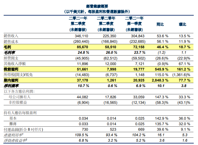 8月12日,華虹半導(dǎo)體公布最新業(yè)績報告顯示,該公司在第二季度和今年上半年的營收均創(chuàng)新高。據(jù)披露,今年第二季度,華虹半導(dǎo)體營收達(dá)3.461億美元,同比上升53.6%,環(huán)比上升13.5%;毛利率24.8%,同比下降1.2個百分點(diǎn),環(huán)比上升1.1個百分點(diǎn);歸母凈利潤4410萬美元,上年同期為1,780萬美元,上季度為3310萬美元。
