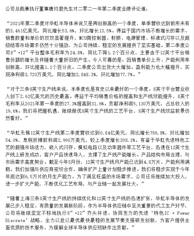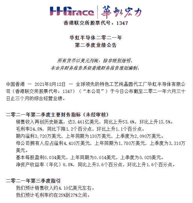 華虹半導(dǎo)體二季度業(yè)績發(fā)布 單季營收創(chuàng)新高