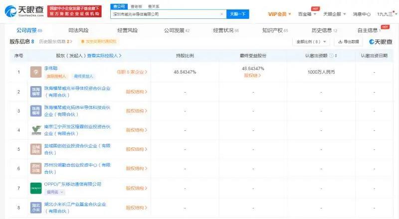 深圳市威兆半導(dǎo)體有限公司成立于2012年12月,法定代表人為李偉聰,經(jīng)營(yíng)范圍包括半導(dǎo)體產(chǎn)品、電子產(chǎn)品的設(shè)計(jì)、技術(shù)開(kāi)發(fā)與銷(xiāo)售;電子元器件、集成電路、電子產(chǎn)品的研發(fā)、設(shè)計(jì)、技術(shù)轉(zhuǎn)讓、技術(shù)服務(wù)、銷(xiāo)售等。股東信息顯示,該公司由李偉聰、OPPO廣東移動(dòng)通信有限公司、湖北小米長(zhǎng)江產(chǎn)業(yè)基金合伙企業(yè)(有限合伙)等公司共同持股。