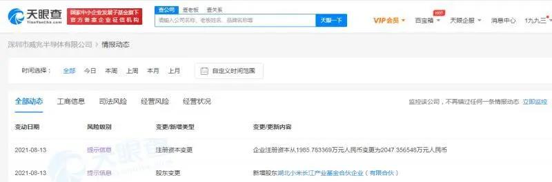 天眼查App顯示,近日,深圳市威兆半導(dǎo)體有限公司發(fā)生工商變更,新增小米關(guān)聯(lián)企業(yè)湖北小米長(zhǎng)江產(chǎn)業(yè)基金合伙企業(yè)(有限合伙)為股東,注冊(cè)資本從約1986萬(wàn)人民幣變更為約2047萬(wàn)人民幣。