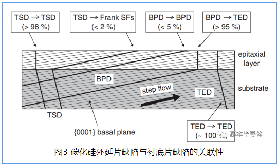 在外延生長過程中,襯底中的TSD約98%轉(zhuǎn)化為TSD,其余轉(zhuǎn)換為Frank SFs;TED則100%轉(zhuǎn)化為TED;BPD約95%轉(zhuǎn)化為TED,少量維持BPD。