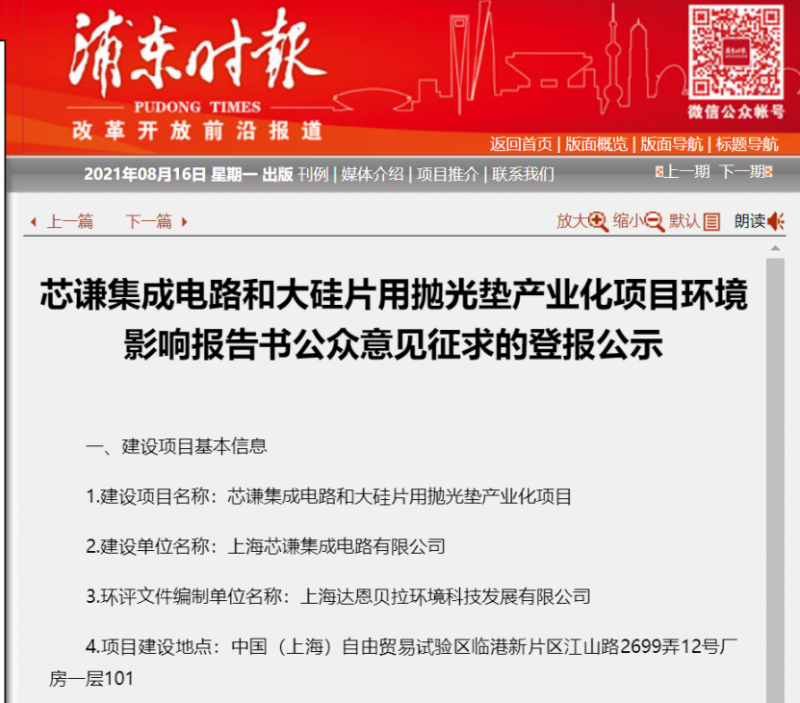 8月16日,浦東時報刊登了芯謙集成電路和大硅片用拋光墊產(chǎn)業(yè)化項目環(huán)境影響報告書公眾意見征求的登報公示。