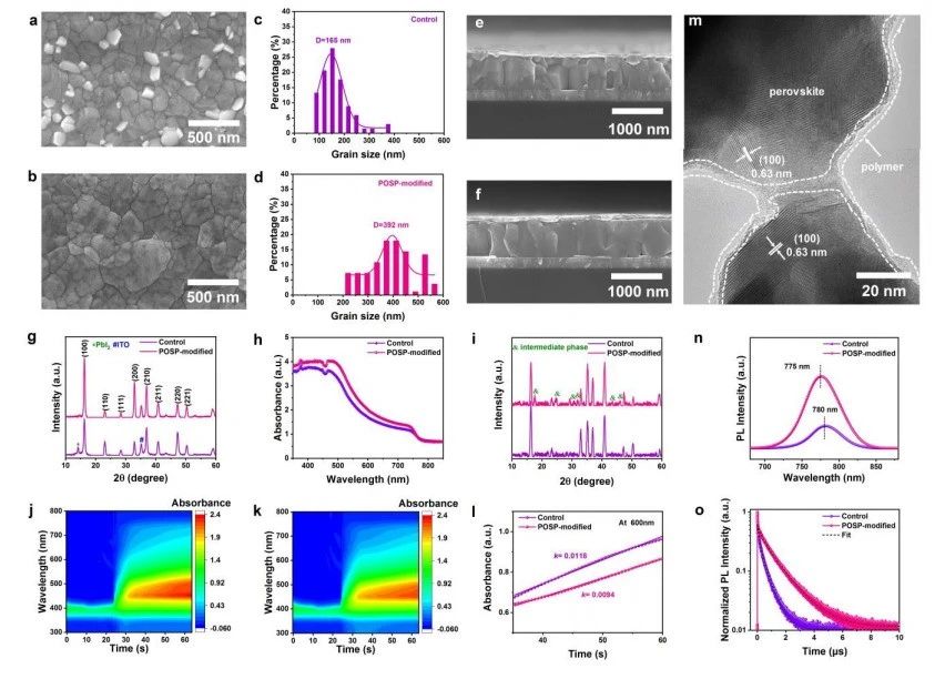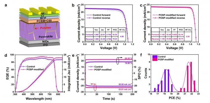 西北工業(yè)大學(xué)的李炫華團(tuán)隊(duì)提出了一種多齒交聯(lián)策略,利用三維星形聚合物中的多支鏈和足夠的化學(xué)錨定位點(diǎn)直接與鈣鈦礦材料在多個(gè)方向上螯合,從而調(diào)節(jié)鈣鈦礦的形貌,鈍化表面缺陷/晶界缺陷,抑制非輻射復(fù)合,提高器件穩(wěn)定性。因此,改進(jìn)的倒置 PSC 獲得了 22.74% 的最佳效率,這是倒置 PSC 中報(bào)告的最高值之一。