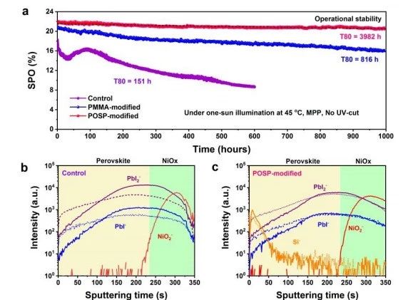 同時(shí),封裝的改進(jìn)裝置在 45°C 下最大功率點(diǎn)跟蹤 1000 小時(shí)后,運(yùn)行穩(wěn)定性表現(xiàn)優(yōu)異,仍保留初始效率為 93%(~22.00%),同時(shí)估計(jì) T80(衰減到 80%初始效率的時(shí)間) 接近 4000 小時(shí)。三維星形聚合物多齒交聯(lián)策略已被證明是實(shí)現(xiàn)PSC商業(yè)應(yīng)用的新方向。