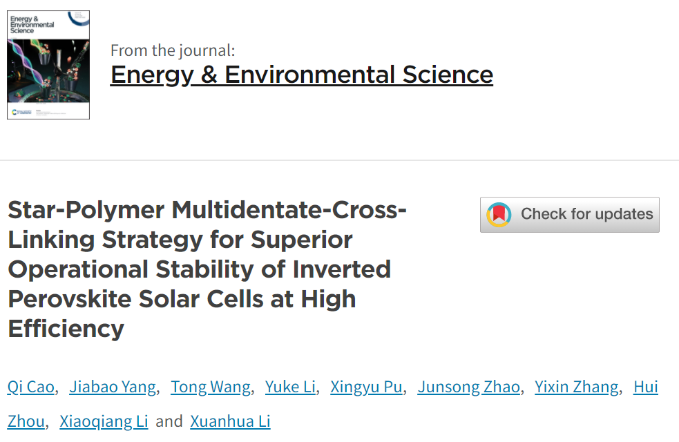 Qi Cao et al. Star-Polymer Multidentate-Cross-linking Strategy for Superior Operational Stability of Inverted Perovskite Solar Cells at High Efficiency, Energy Environ. Sci., 2021.