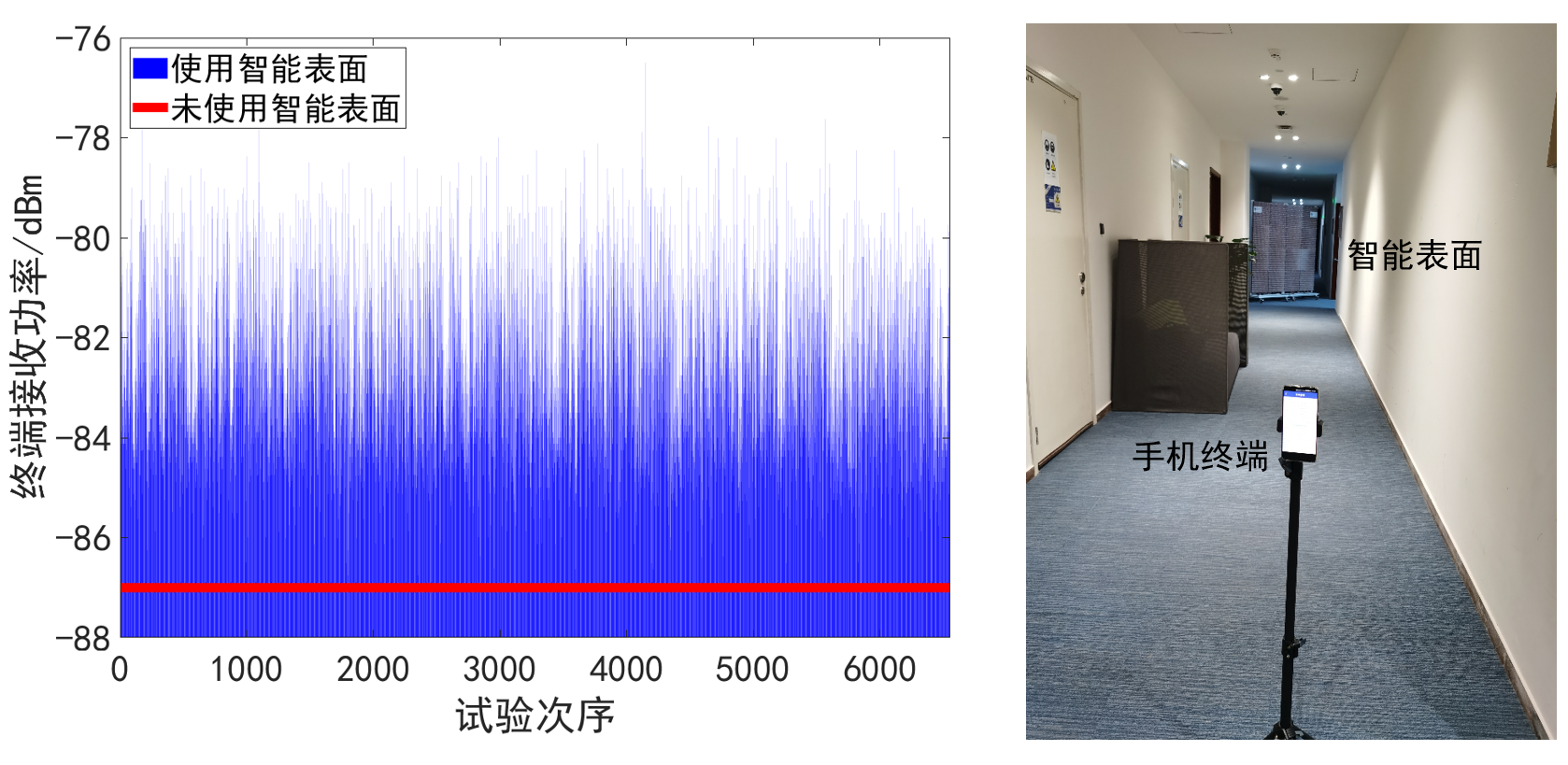 圖2 左圖:智能表面應(yīng)用于室內(nèi)場景,改善5G信號覆蓋試驗結(jié)果;右圖:室內(nèi)測試實景