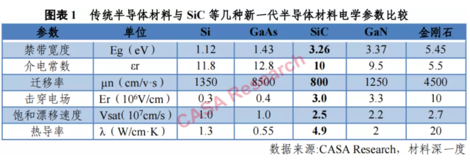 SiC材料具有高擊穿電場(chǎng)強(qiáng)度、高熱導(dǎo)率、高電子飽和率、高漂移速率,以及高抗輻射能力等優(yōu)越性能,這些優(yōu)勢(shì)有望大幅降低電力電子裝置的損耗和體積、重量,因而SiC電力電子器件在高效率、高頻率和高溫度的電力電子應(yīng)用領(lǐng)域,具有Si功率器件難以比擬的巨大應(yīng)用優(yōu)勢(shì)和廣闊的應(yīng)用前景。SiC 作為第三代化合物半導(dǎo)體,相比Si具有大禁帶寬度、高臨界擊穿場(chǎng)強(qiáng)、高熱導(dǎo)率三個(gè)最顯著特征。4H-SiC的禁帶寬度是Si的3倍,因此SiC材料能夠在更高溫(如汽車電子)下穩(wěn)定工作。SiC的臨界擊穿場(chǎng)強(qiáng)可以達(dá)到Si的10倍,與Si器件相比,SiC 可以在更高雜質(zhì)濃度、更薄漂移層厚度的情況下制作出高耐壓功率器件。從而同時(shí)實(shí)現(xiàn)“高耐壓”、“低導(dǎo)通電阻”、“高頻”三個(gè)特性。SiC 的導(dǎo)熱率可達(dá) Si 的 3 倍,因此能夠提高熱傳導(dǎo)能力。隨著電子元器件集成度提升,功率和密度增大,單位體積發(fā)熱量增加,高導(dǎo)熱率的材料有利于元器件向更小型化發(fā)展。