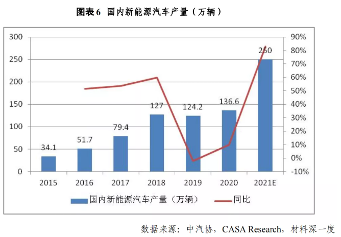 據(jù)國(guó)際能源機(jī)構(gòu)(IEA)統(tǒng)計(jì),中國(guó)新能源汽車的市場(chǎng)規(guī)模占全球的40%-50%。我國(guó)2020年新能源汽車產(chǎn)量為136.6萬(wàn)輛,預(yù)計(jì)2021年產(chǎn)量將達(dá)到250萬(wàn)輛,同比增長(zhǎng)83%。