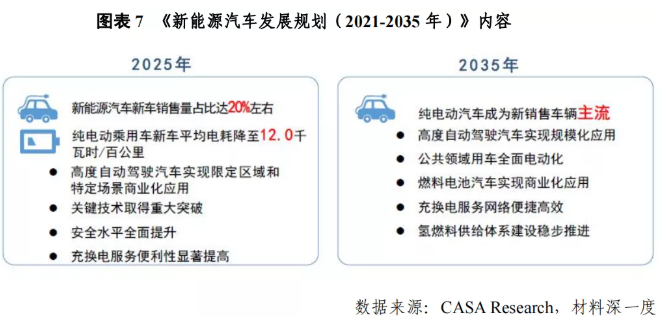 CASA Research預(yù)計(jì)國(guó)內(nèi)2025年新能源汽車產(chǎn)量將達(dá)到640萬(wàn)輛,2030年達(dá)到1520萬(wàn)輛,2035年達(dá)到2000萬(wàn)輛。根據(jù)《新能源汽車發(fā)展規(guī)劃(2021-2035年)》(國(guó)辦發(fā)(2020)39號(hào)),到2025年,我國(guó)新能源汽車新車銷量占比達(dá)到20%左右;到2035年,純電動(dòng)汽車成為新銷售車輛的主流,公共領(lǐng)域用車全面電動(dòng)化。