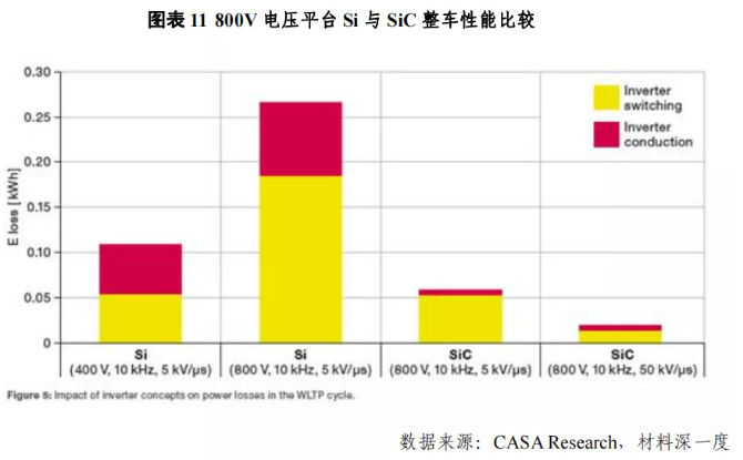 另外,新能源汽車電驅(qū)動(dòng)直流電壓平臺(tái)逐漸上升到800V,SiC功率半導(dǎo)體將成為必然選擇。從400V提升到800V,意味著電動(dòng)汽車所有的高壓元器件及管理系統(tǒng)都要提高標(biāo)準(zhǔn),首當(dāng)其沖的就是逆變器。功率器件是電動(dòng)汽車逆變器的核心能量轉(zhuǎn)換單元,目前,傳統(tǒng)IGBT通常適應(yīng)的高壓平臺(tái)在600-700V左右,如果直流母線電壓提升到800V以上,那么對(duì)應(yīng)的功率器件耐壓則需要提高到1200V左右。SiC由于其高耐壓的特性,在1200V的耐壓下阻抗遠(yuǎn)低于Si,對(duì)應(yīng)的導(dǎo)通損耗會(huì)相應(yīng)降低,同時(shí)由于SiC可以在1200V耐壓下選擇MOSFET封裝,可以大幅降低開(kāi)關(guān)損耗,這將大幅提高功率器件的效率,有研究指出,應(yīng)用1200V的碳化硅模塊較750V的IGBT模塊可以將整車能耗降低7.9%。