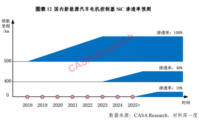 據(jù)調(diào)研了解,國(guó)內(nèi)新能源汽車?yán)m(xù)航里程500km以上車型的電機(jī)控制器SiC滲透率將逐漸加速,到2023年左右達(dá)到100%;續(xù)航里程400km-500km新能源汽車車型電機(jī)控制器將在2023年左右開(kāi)始使用SiC功率半導(dǎo)體,整體滲透率在40%左右;續(xù)航里程400km以下車型電機(jī)控制器將在2025年以后使用SiC功率半導(dǎo)體,整體滲透率小于10%。