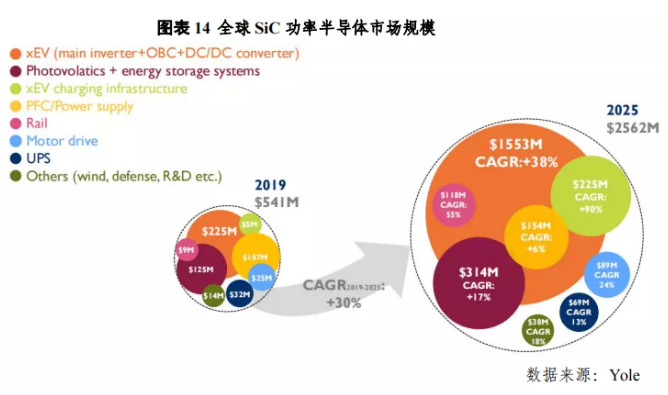 國(guó)內(nèi)新能源汽車SiC功率半導(dǎo)體市場(chǎng)引領(lǐng)全球SiC市場(chǎng)發(fā)展。據(jù)Yole 2020年發(fā)布的數(shù)據(jù)顯示,2019年全球新能源汽車SiC功率半導(dǎo)體市場(chǎng)規(guī)模約為14.6億元,年均復(fù)合增長(zhǎng)率38%,到2025年市場(chǎng)規(guī)模約為100億元。2019年全球充電基礎(chǔ)設(shè)施SiC功率半導(dǎo)體市場(chǎng)規(guī)模約為3250萬(wàn)元,年均復(fù)合增長(zhǎng)率90%,到2025年市場(chǎng)規(guī)模約為14.6億元??傮w來(lái)看,Yole 在2020年對(duì)新能源汽車SiC功率半導(dǎo)體的市場(chǎng)預(yù)期偏低,對(duì)我國(guó)市場(chǎng)的發(fā)展預(yù)估不足。