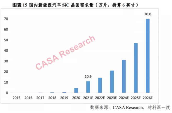 據(jù)CASA Research測(cè)算,國(guó)內(nèi)2021年新能源汽車市場(chǎng)6英寸SiC晶圓需求量超過(guò)10萬(wàn)片,預(yù)計(jì)到2026年需求量將增長(zhǎng)到近70萬(wàn)片。若考慮新能源汽車、PV光伏、5G電源、軌道交通等其他應(yīng)用,國(guó)內(nèi)2021年6英寸SiC晶圓需求量在20-25萬(wàn)片之間,預(yù)計(jì)到2026年需求量將增長(zhǎng)到150萬(wàn)-200萬(wàn)片之間。