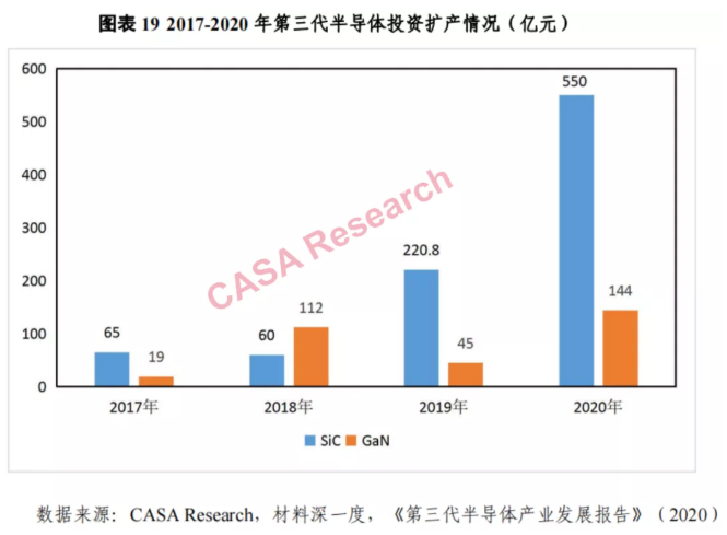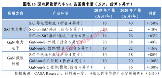 據(jù)《第三代半導(dǎo)體產(chǎn)業(yè)發(fā)展報(bào)告》(2020年)數(shù)據(jù)顯示,國(guó)內(nèi)SiC導(dǎo)電型襯底折算4英寸產(chǎn)能約為40萬(wàn)片/年,SiC-on-SiC 外延片(表示在碳化硅襯底上沉積碳化硅)折算 6 英寸產(chǎn)能約為22萬(wàn)片/年,SiC-on-SiC 器件/模塊(4/6 英寸兼容)產(chǎn)能約26萬(wàn)片/年。