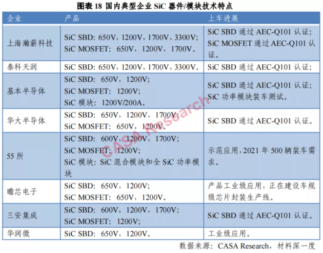 產(chǎn)品慢,市場(chǎng)快。整體來(lái)看,國(guó)際企業(yè)從產(chǎn)品數(shù)量、技術(shù)指標(biāo)、企業(yè)規(guī)模等各方面都超過(guò)國(guó)內(nèi)企業(yè),國(guó)內(nèi)下游整車企業(yè)從產(chǎn)品可靠性、批量供應(yīng)能力等方面考慮優(yōu)先選擇國(guó)外大企業(yè)進(jìn)行合作,國(guó)內(nèi)SiC產(chǎn)品上車適用的機(jī)會(huì)較少。國(guó)內(nèi)能批量生產(chǎn)SiC單晶襯底的公司包括天科合達(dá)、山東天岳、爍科晶體、同光晶體等,中科鋼研、南砂晶圓、福建北電新材料、世紀(jì)金光、中電化合物、江蘇超芯星等公司具備供貨能力。批量出貨的SiC外延企業(yè)為瀚天天成和東莞天域,中電科55所、中電科13主要自用。SiC器件能夠出貨的企業(yè)主要有泰科天潤(rùn)、55所、華潤(rùn)微、上海瀚薪科技、瞻芯電子、基本半導(dǎo)體、鍇威特、三安集成等。SiC模塊目前正在推進(jìn)布局的企業(yè)包括華微電子、士蘭微、江蘇宏微、斯達(dá)半導(dǎo)體、中恒微、芯聚能等。
