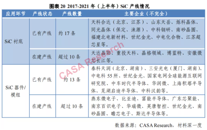 另一方面,“產(chǎn)線多、產(chǎn)品少”的現(xiàn)象較為突出。由于5G、人工智能、新能源等發(fā)展提速,對(duì)半導(dǎo)體需求猛增,產(chǎn)業(yè)的關(guān)注度日益增高,國(guó)產(chǎn)化替代成為發(fā)展趨勢(shì),也出現(xiàn)了各地方半導(dǎo)體項(xiàng)目一哄而上、部分低水平重復(fù)的現(xiàn)象,第三代半導(dǎo)體相關(guān)項(xiàng)目估值過(guò)高,造成了不理性的市場(chǎng)表現(xiàn)和資源浪費(fèi)。據(jù)CASA Research不完全統(tǒng)計(jì),截至2021年上半年,SiC襯底已有產(chǎn)線17條,在建產(chǎn)線超過(guò)10條;SiC器件/模組已有產(chǎn)線13條,在建產(chǎn)線超過(guò)10條。但是,能夠批量出貨的產(chǎn)線并不多。