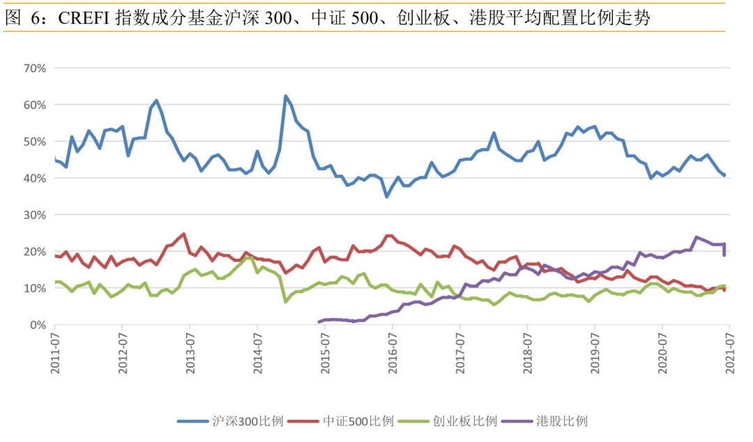 滬深300指數(shù)成分股平均配置比例為40.98%,較上月末上升0.30%;中證500指數(shù)成分股平均配置比例為9.36%,較上月末下降0.40%;創(chuàng)業(yè)板平均配置比例為10.49%,較上月末下降0.12%。