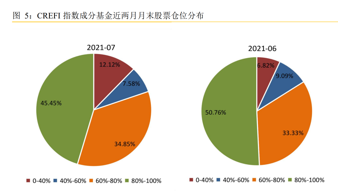 與此同時,高倉運作的私募也變少了。7月末股票持倉超過五成的成份基金比例為86.37%,較6月末下降3.79個百分點。倉位在80%至100%的成分基金也下降了超5個百分點至45.45%。